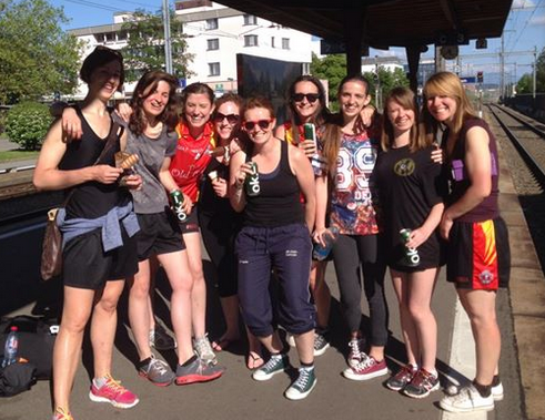 According to the ECB rules, a tournament, even between two teams, has to consist of at least an hour’s play. In this case, the captains agreed amicably to play two half-hour matches, in addition to accepting that we would take two brand-new camogues, Daniela from Lugano and Julia from Dresden, for their first camogie matches (hopefully the experience will encourage them to gather more players and to travel to more tournaments!). We started off playing 12-a-side (until Daniela took out a Zürcher). This old-school formation was new to most of us, consisting of a goalkeeper, three full backs, 1 centre half back, three midfielders, 1 centre half forward and three full forwards. In European terms, we created history with 24 players on the pitch and were able to put into practice all the skills our cherished captain had drilled into us since January. Burning on the goal-line, Maja kept a sharp eye on the ball and on her backs, Eimear, Aisling, Sylvia and Caoimhe. Eimear defended any ball foolish enough to cross her path, while Caoimhe and Aisling made savage attacks into the forward line. There were some fantastic overlaps with Margaux in midfield, clearing up every ball with speed and earning herself a deserved Player of the Tournament trophy. Coop, also in midfield, undid all the rest and relaxation of her holiday by turning into a beast. In the forward line, Jelena and Caoimhe D launched attack after attack on the Zurich goal, using defensive skills to score goals. While everyone else ran their legs off, Irene, our talented captain, chose her wise moments to pop score after score over the bar. By the second match, the sun was high in the sky and baking down on our helmets, so the full time whistle was welcome relief.